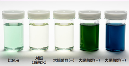 自然光下で青~青緑色の呈色が確認された場合、大腸菌群陽性と判定