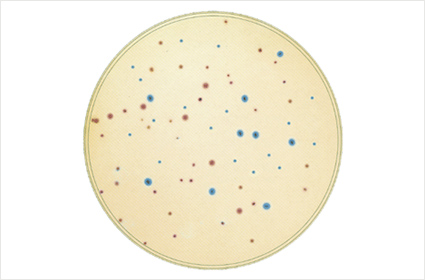 酵素基質培地とは、細菌が保有する酵素と、培地中の特定の物質(基質)が反応し、培養後のコロニーを着色あるいは発光させることで、コロニーの計数や判定を容易にできる技術です。