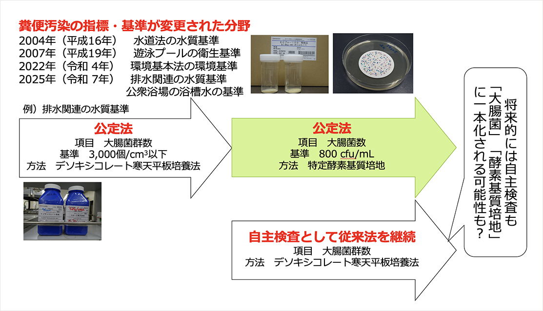 水質汚濁防止法や建築基準法などの排水基準の改正に伴い、2025年(令和7年)4月から工場や施設からの排水や、河川や地下水などにおける糞便による汚染の指標が「大腸菌群数:3,000個/cm3以下(検査法:デソキシコレート寒天平板培養法)」から「大腸菌数:800 cfu/mL(検査法:特定酵素基質培地)」に変更されました。
