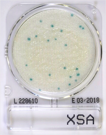 黄色ブドウ球菌は1~2 mmの比較的はっきりとした青い発色を示します。うっすらとした広がったコロニーは黄色ブドウ球菌ではありませんのでカウントから除外してください。