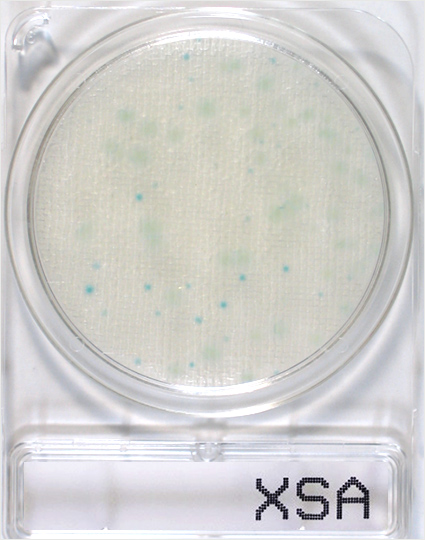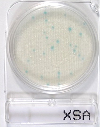 Staphylococcus aureus (黄色ブドウ球菌)は、水色〜青色のコロニー、それ以外のStaphylococcus 属菌(表皮ブドウ球菌など)は、発育を抑制されるか、発育しても微小な白色コロニーを形成します。24時間を越えて培養すると表皮ブドウ球菌の白いコロニーが発色してきてしまいますので、培養時間は時間厳守してください。