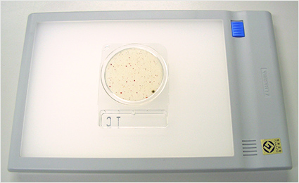 コンパクトドライに発育したコロニーを測定する際、白いボード(LEDトレース台)で裏からライトアップしますと、よりコロニーがはっきりと見えます。