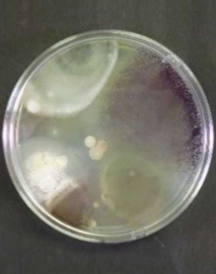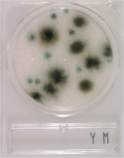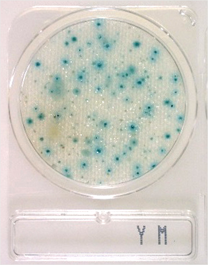 ページ上部のジャガイモ 102倍希釈の写真のように、カビは、大きく広がったカビ自体の色(酵素基質により青く染まることもあります)のコロニーを形成します。