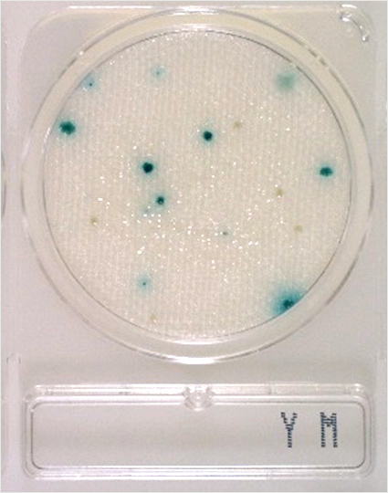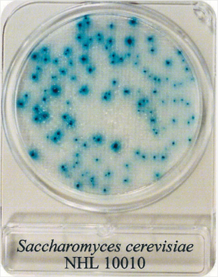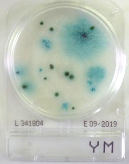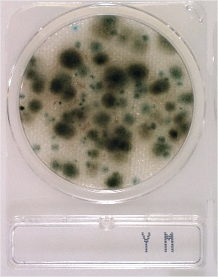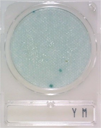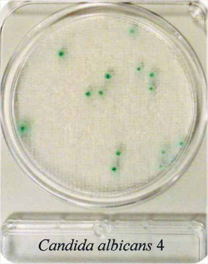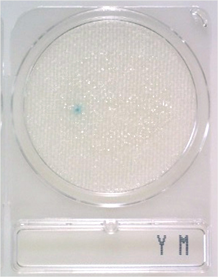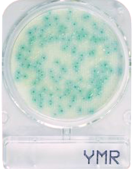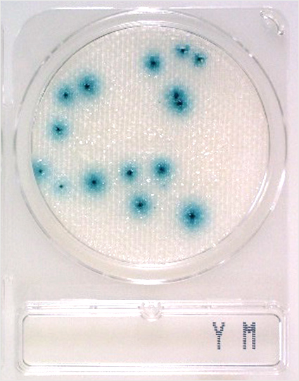 酵母は比較的輪郭のはっきりした丸いコロニーを形成し、発色酵素基質X-Phosによりコロニー自体や周辺培地を青~緑色に発色させます。